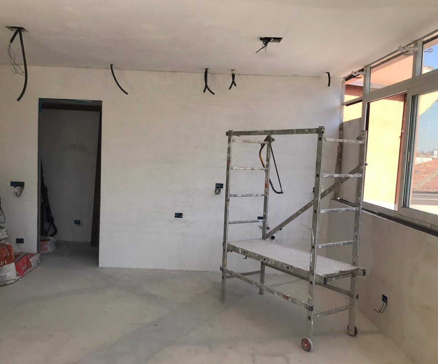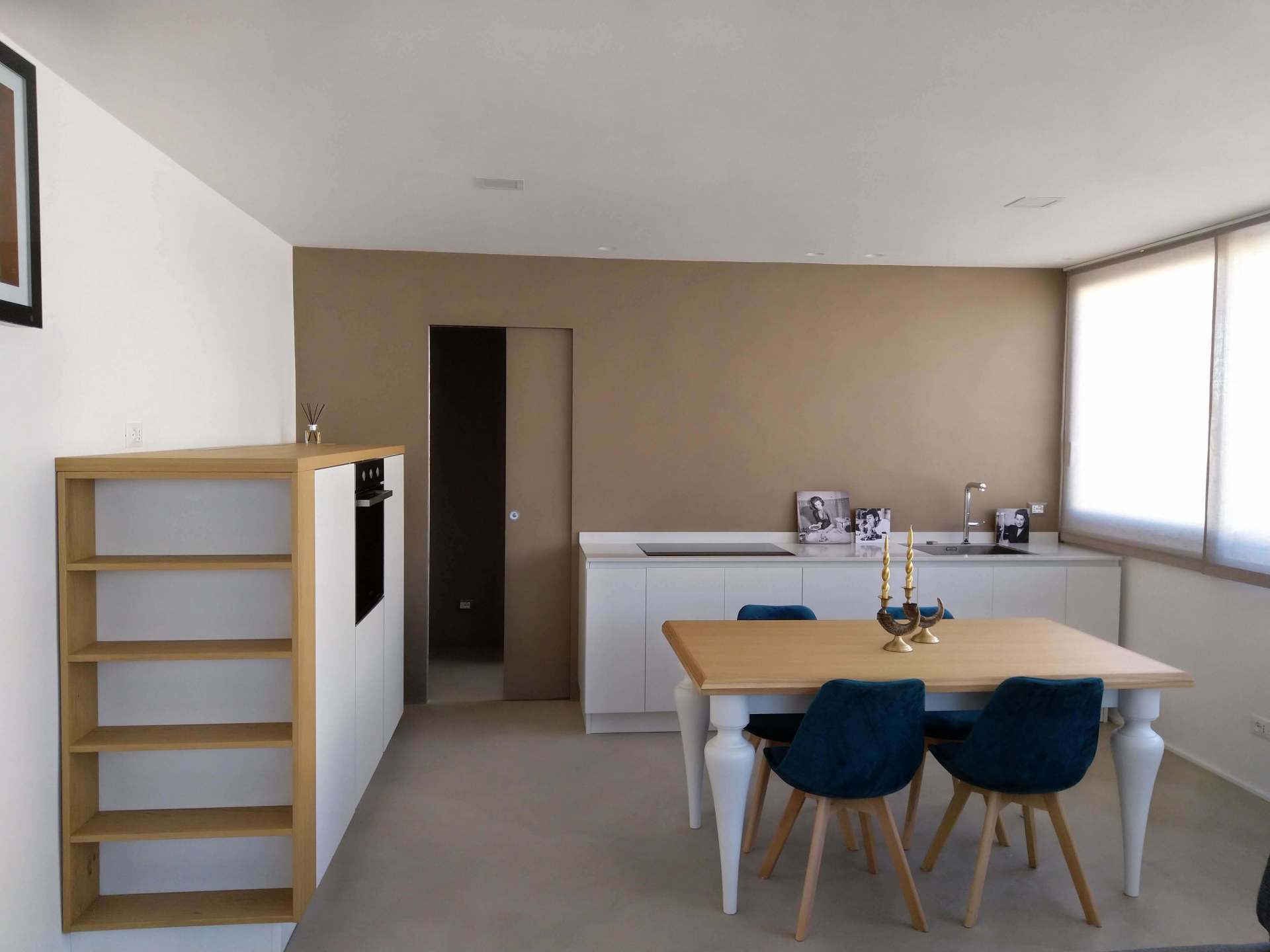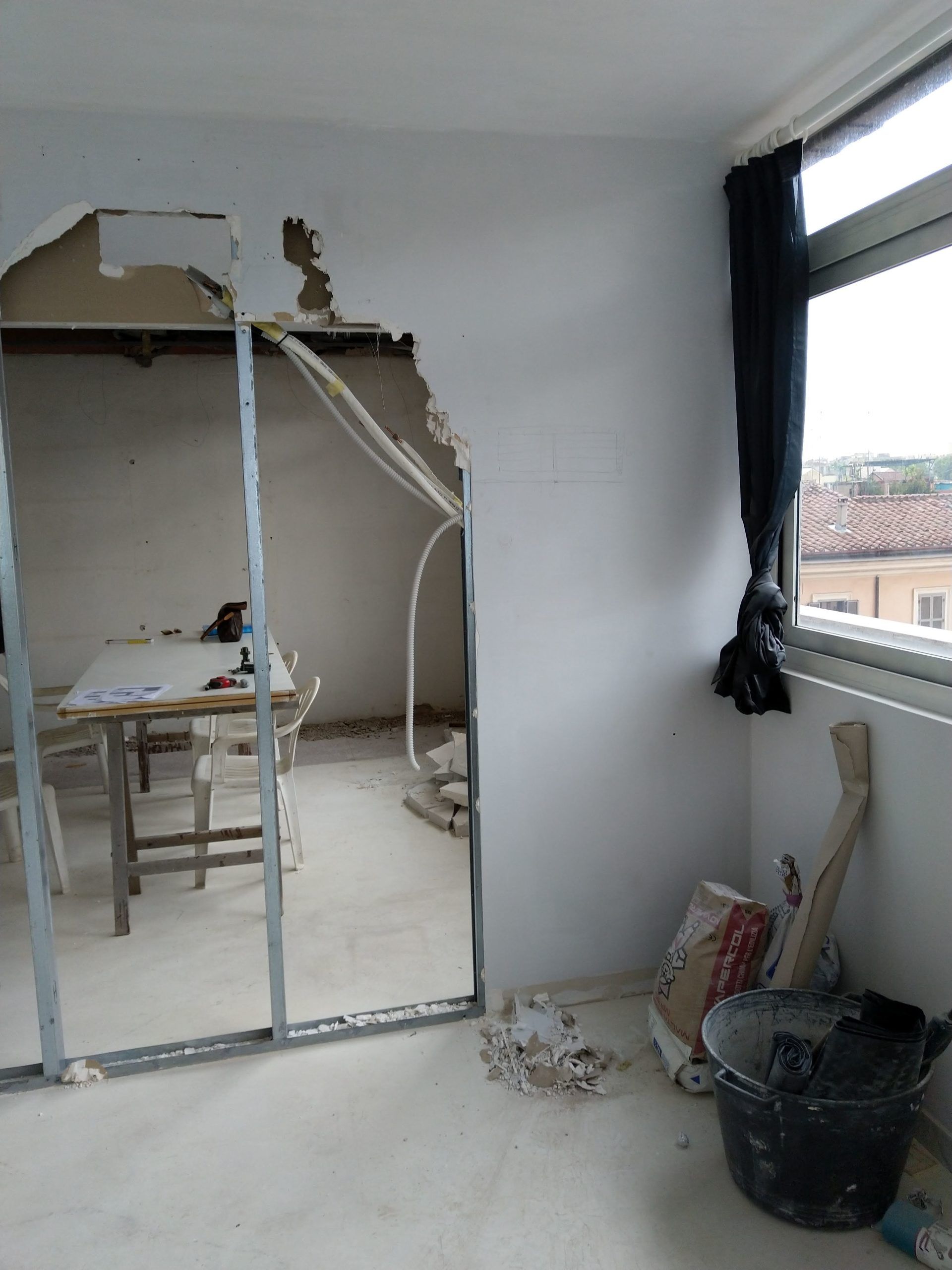 Oltre alla riqualificazione completa degli impianti idraulici ed elettrici, la creazione di nuovi tramezzi, abbiamo previsto anche l'innalzamento del massetto originale per riequilibrare un dislivello esistente di 80 cm tra la veranda e il resto dell'appartamento.