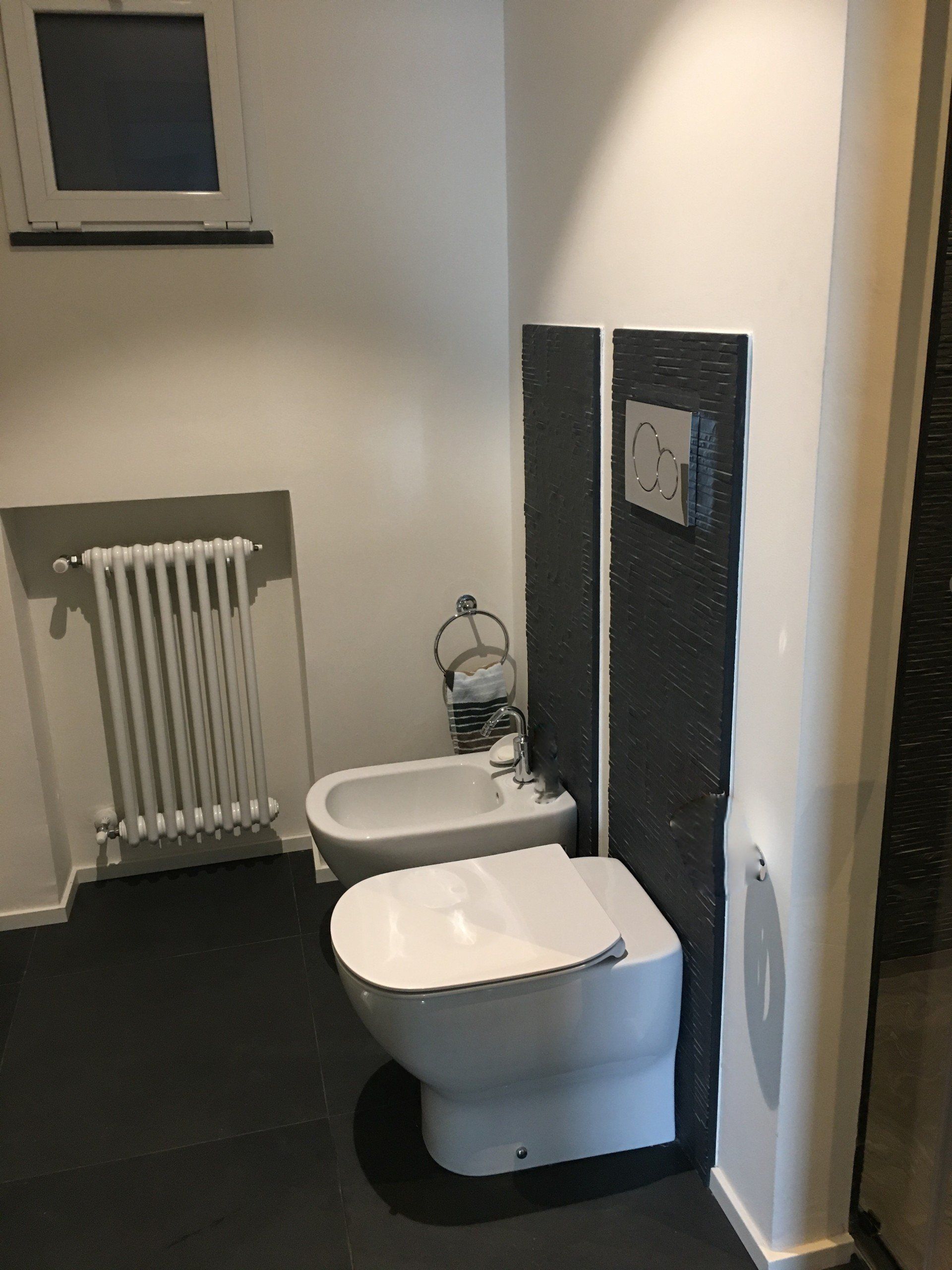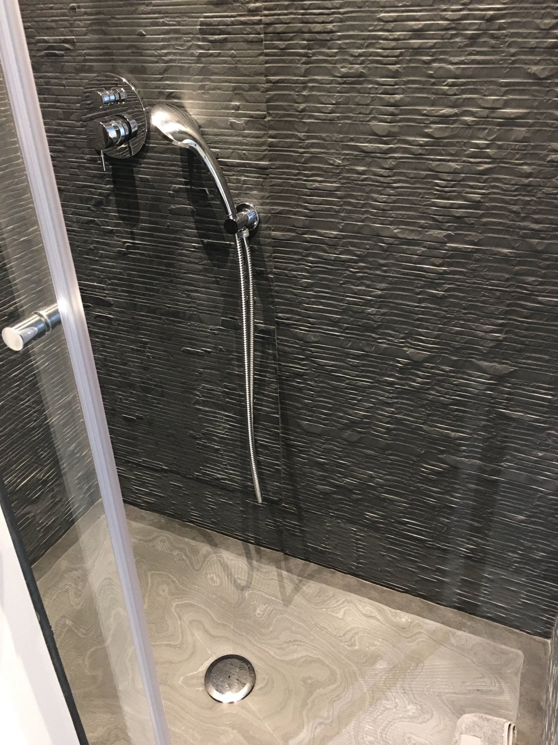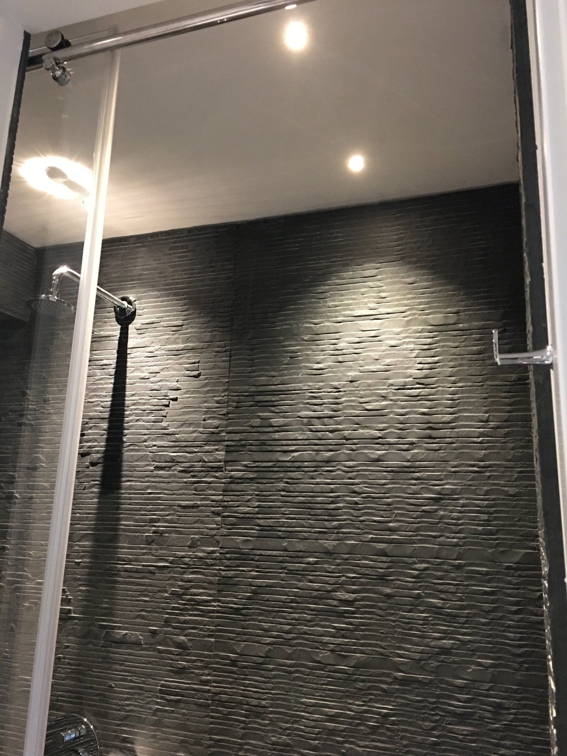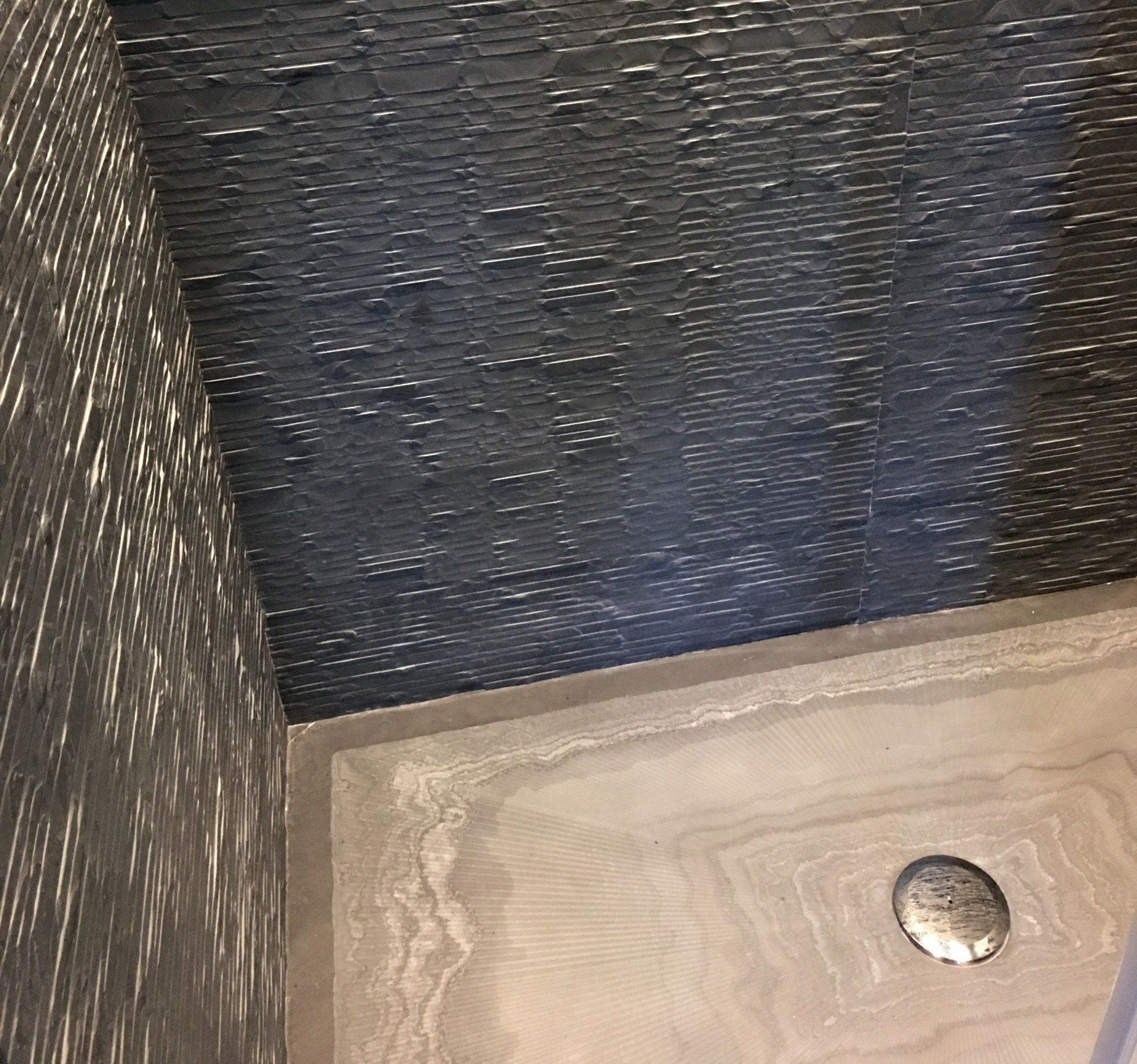 L'esclusività in questo lavoro, è stata nei rivestimenti realizzati per i bagni, grandi lastre dalla lavorazione molto particolare e di grande effetto, posate nelle docce e dietro i sanitari, i grandi piatti doccia dalle mille venature che risaltavano con lo scorrere dell'acqua e i lavabi, monoliti di ardesia lavorati a regola d'arte