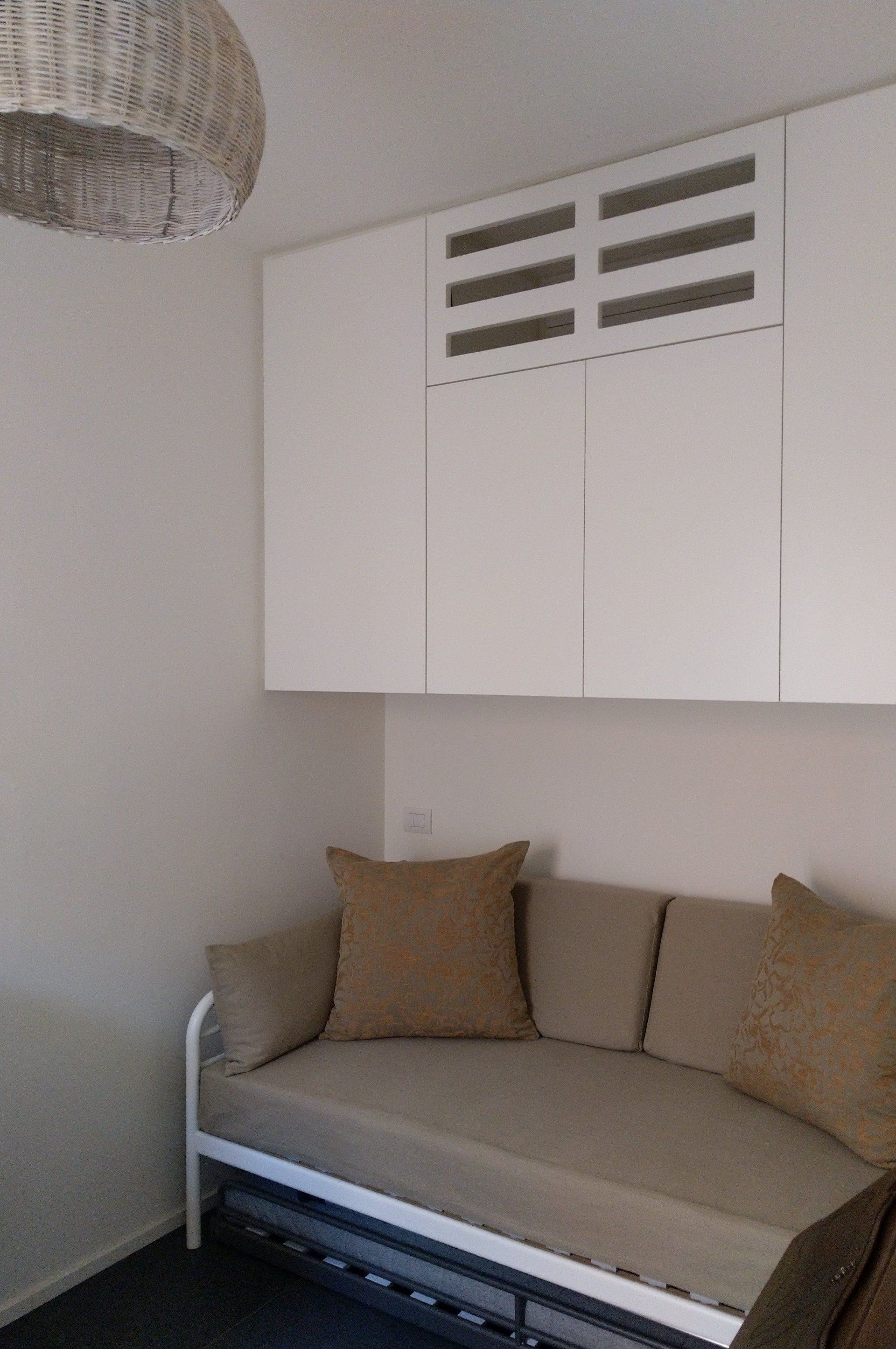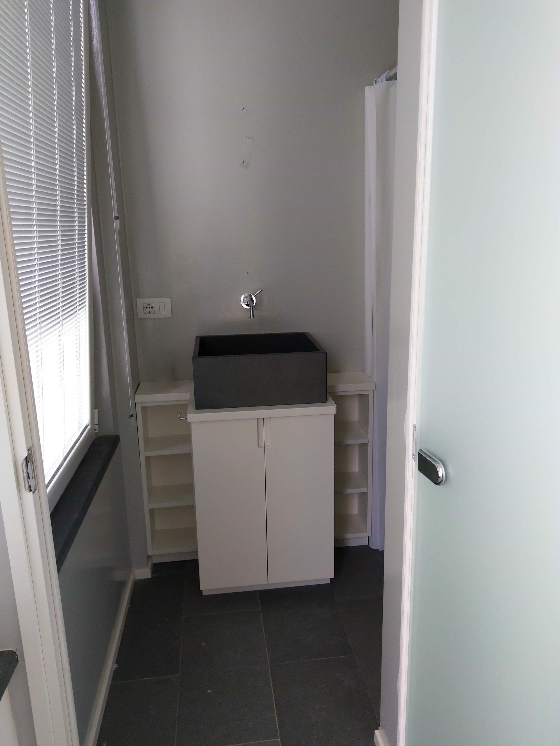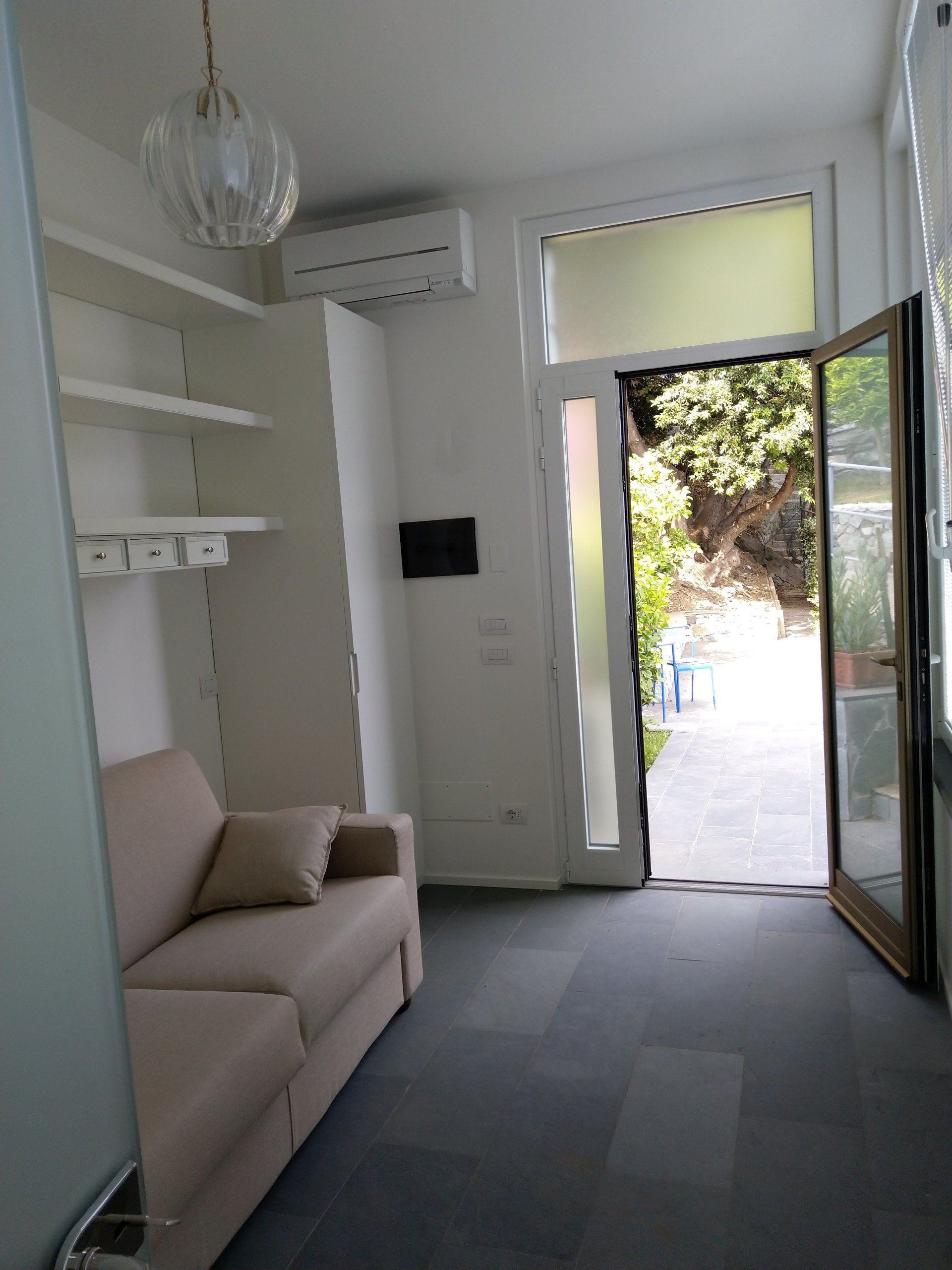 L'ampliamento, ci ha permesso di costruire una dependance di 20 mq, sottostante alla prima terrazza pergolata arrivata così a misurare 50 mq, un monolocale indipendente con un grande sguardo verso l'orizzonte blu, corredato di ogni comfort, compreso di un bagno finestrato con doccia e con accesso diretto alla seconda terrazza di 40 mq e al giardino.