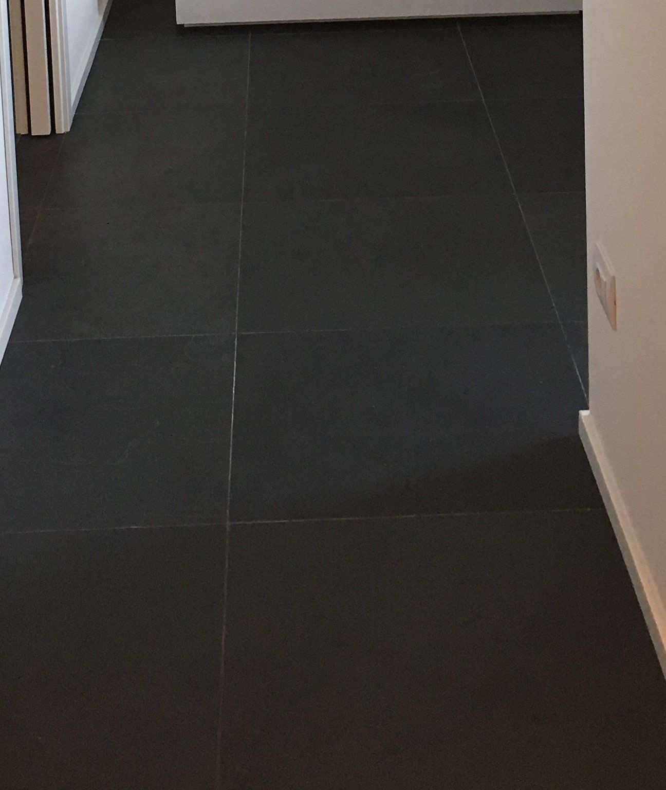 Per la pavimentazione interna ed esterna dell'alloggio, abbiamo optato per un grande formato in nero graffite, mentre per la dependance e il terrazzamento la scelta è ricaduta sull'ardesia grigio oceano.